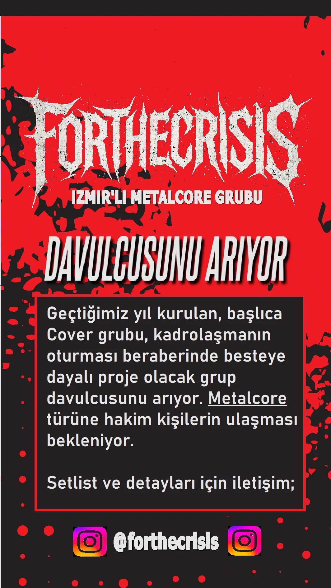 Yaklaşık bir yıldır aktif olmakta olan grup için davulcu aranmakta. Metalcore cover'ları yapmaktayız. Dolayısıyla Killswitch Engage, Asking Alexandria, Bullet for My Valentine, As I Lay Dying vb. grupların şarkılarına ayak uydurabilecek davulcular ulaşırsa daha isabetli olur. Kabaca iki haftada bir düzenli sahne alınıyor. Kadrolaşma sonrası beste odaklı projeler olabilir. Setlist ve detaylı iletişim için;