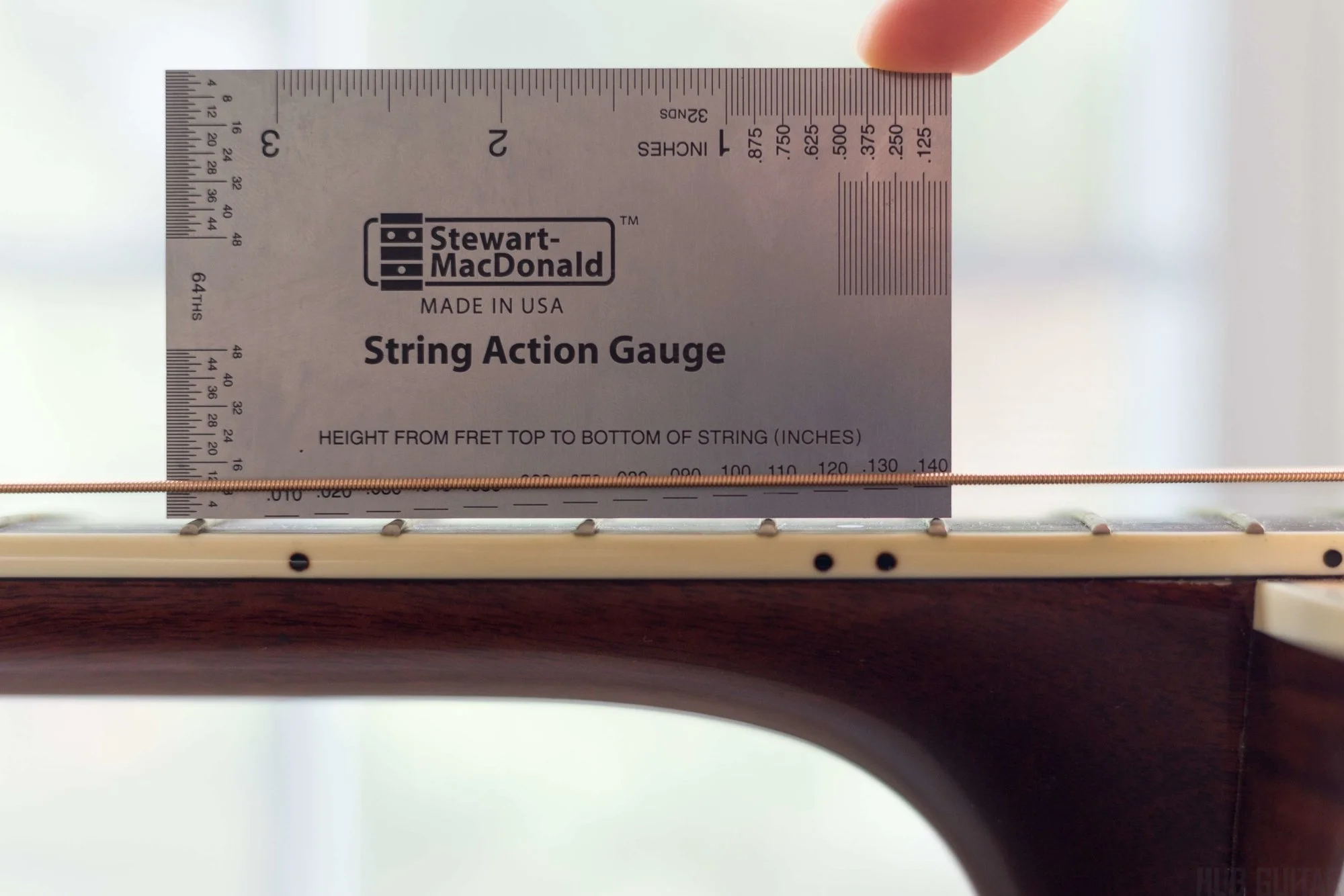 Yarım santim? Bu çok yüksek bir seviye. 1 ile 17. fretlere bastığınızda 8. fret ile tel arası yaklaşık 2 a4 kağıdı olacak dediğim gibi. Belki gitarın durumuna göre biraz daha fazla olabilir. Köprüden yüksekliği de indirin. Kalın mi 2 mm, ince mi teli 1.5 mm olacak şekilde ayarlayın. Eğer sorun hala devam ediyorsa fret seviyelerinde sorun vardır. Üçlü grup olarak incelemeniz lazım. 1-2-3. fretler, 2-3-4. fretler şeklinde kalın teller ve ince teller tarafından bakın. Düz bir nesneyi fretlerin üzerine koyup seviyelerine bakacaksınız. Bunun için fotodaki alet kullanılır genelde ama elinizde muhtemelen yoktur, herhangi bir şey uydurmaya bakın. Bu dediğimi yaparsanız, atıyorum üçlü grubun ortasındaki fret normalden yüksekse fotodaki alet yukarı aşağı oynayacaktır. Göz ile de kontrol etmeyi unutmayın.Yaklaşık yarım santim kadar ama köprü yüksekliğinden dolayı böyle