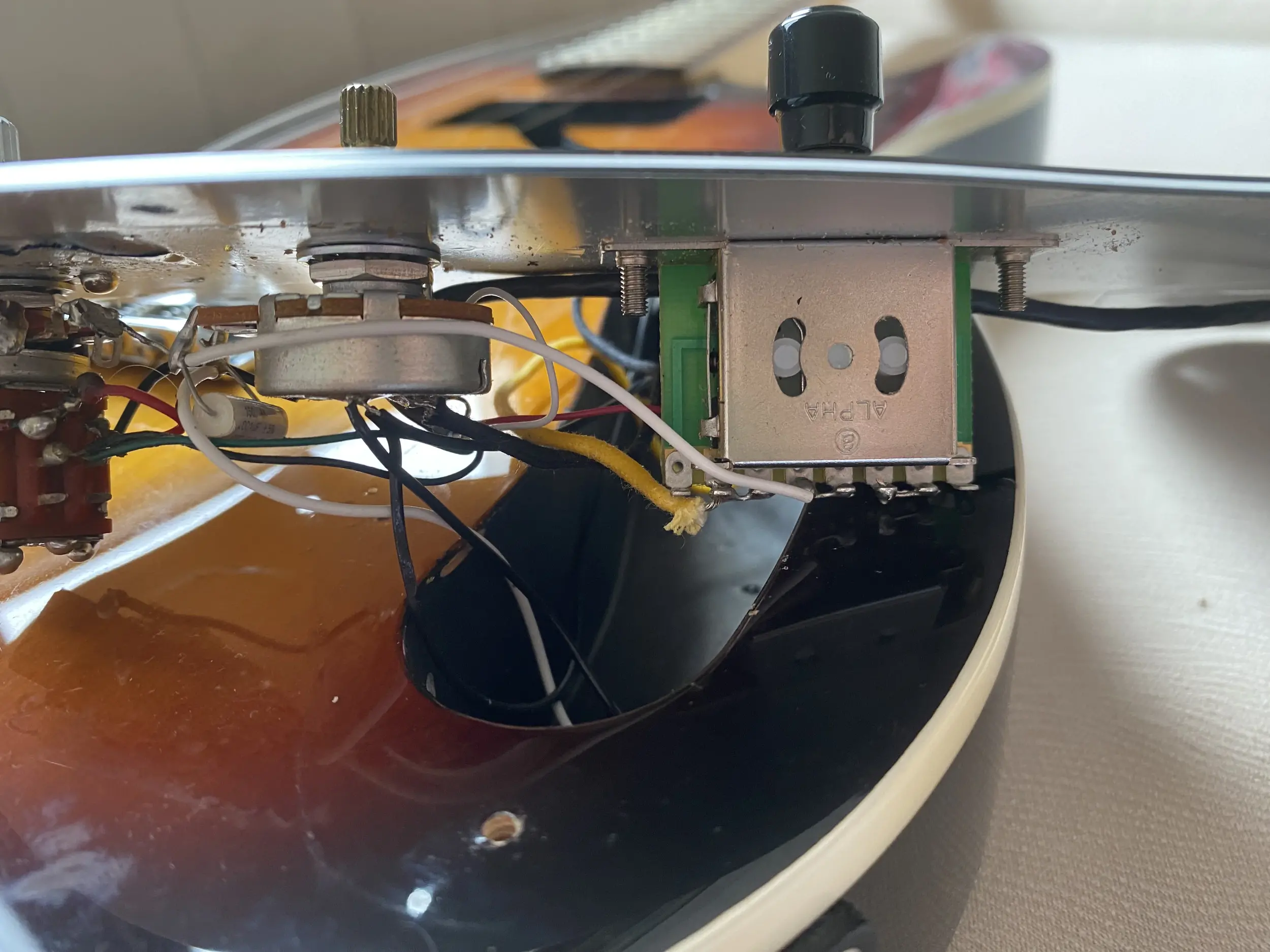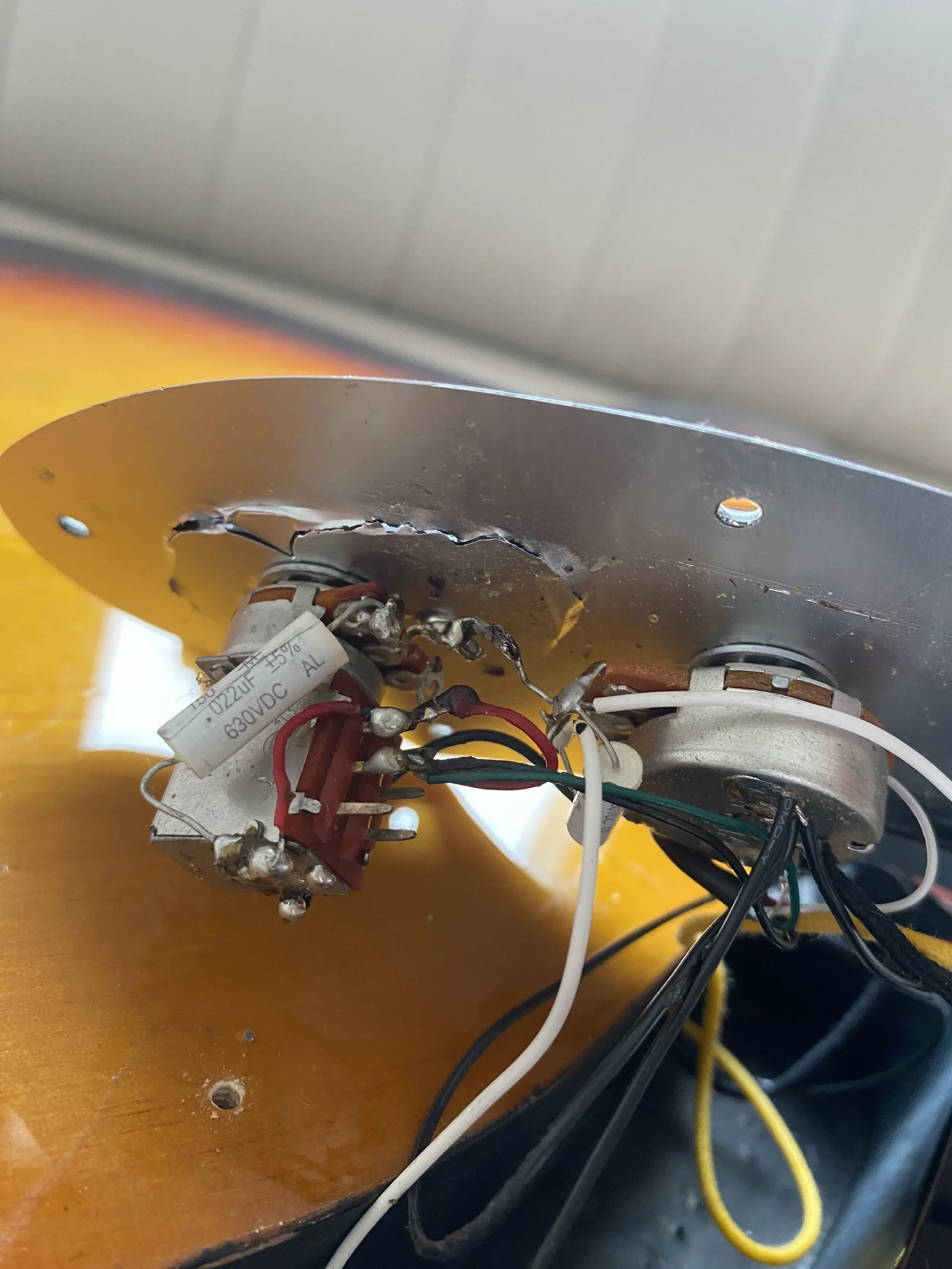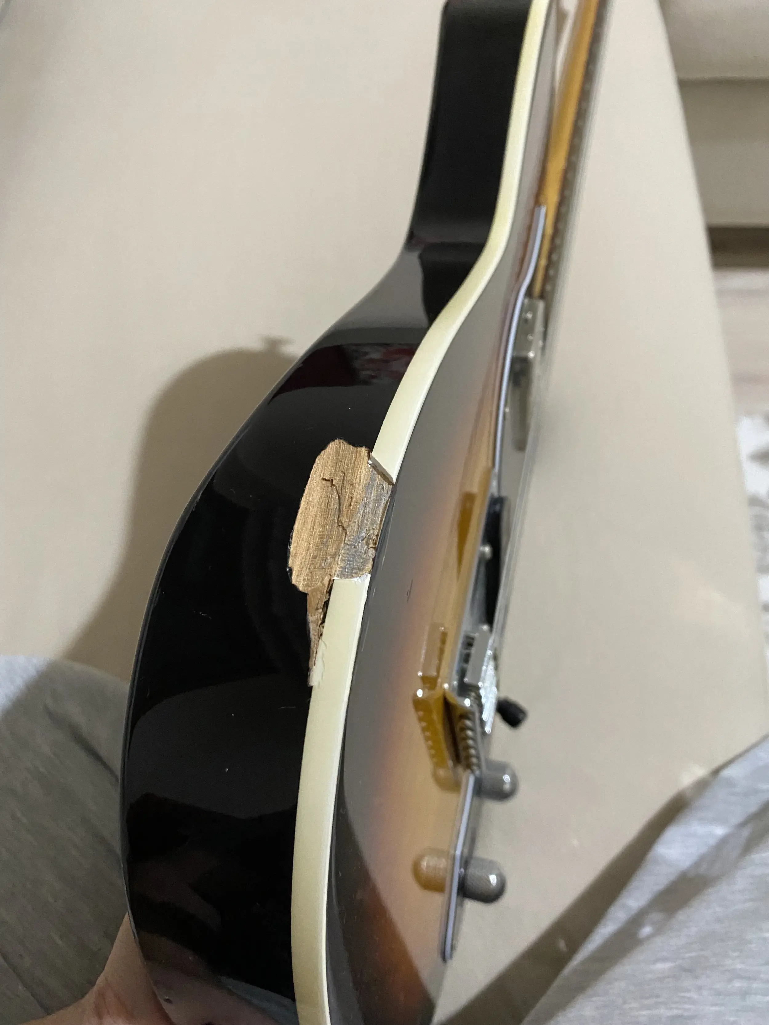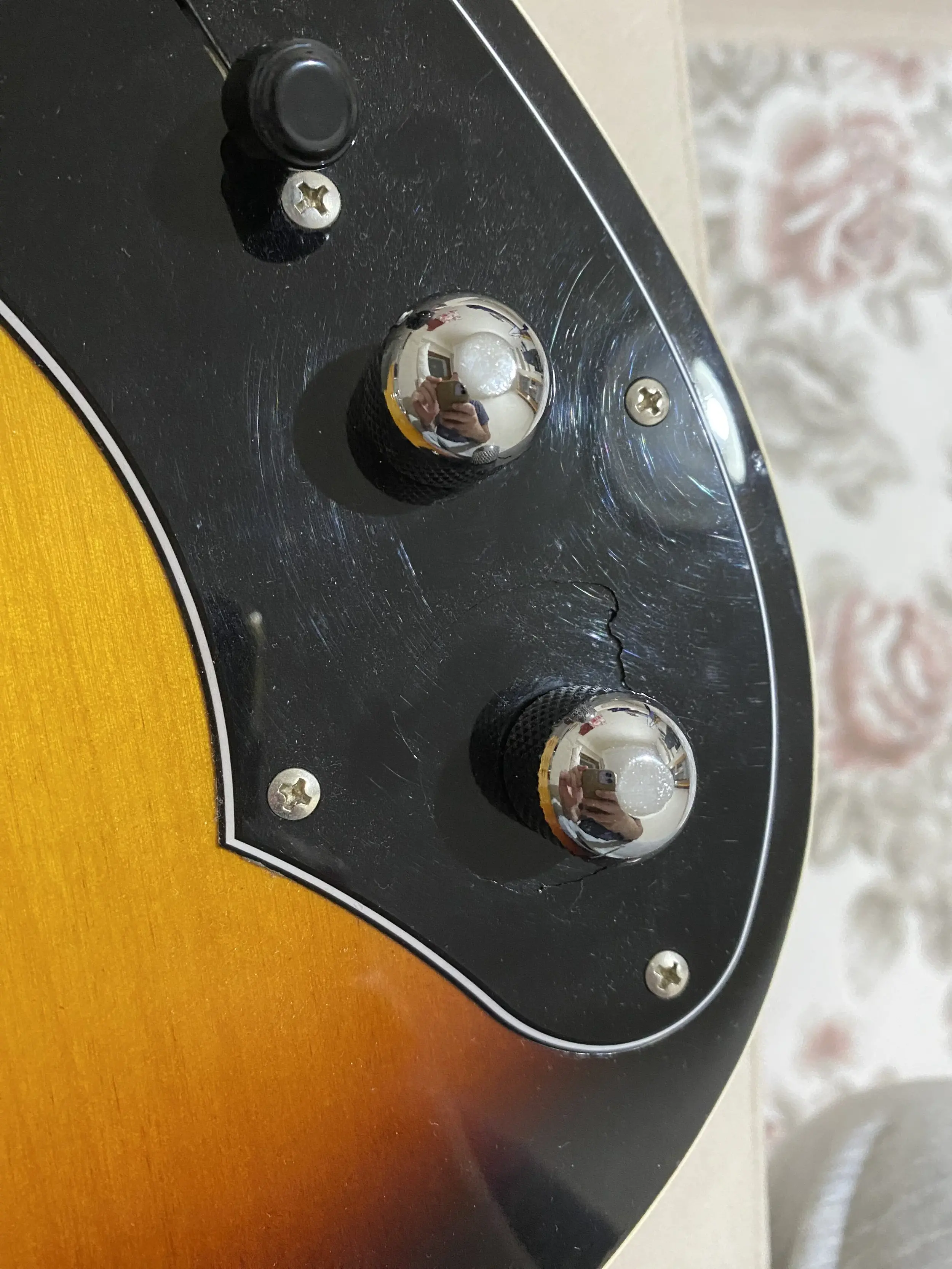 Gitar yaklaşık 1.5m yükseklikten sert zemine düştü. Görsel sıkıntılar fotoğraflarda görünmektedir. Üst eşikte de küçük bir kopma oldu. Bunların haricinde sağ manyetiği ton ile push-pull olarak kullanılabiliyordu ancak o kısımda sıkıntı var kullanılamıyor. Ton potansı çok zor dönüyor(ton potansının olduğu yerde pickguardda çatlak var fotoğrafta görünüyor olmalı) Volume potansı dönüyor ancak zorlanıyor. Jack giriş yerinden olsa gerek çalarken cızırtılar oluyor. Gitarın durumu böyle. Yanında orijinal gigbag dahildir.