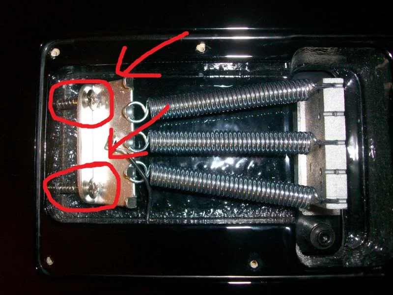 Gitarınızın akordu doğru ise gitarınızın arkasında bulunan kırmızı işaretli vidaları hafif hafif gevşetirseniz dengeli şekilde köprü yüzer konuma gelir. Tekrar akord yapar duruma bakarsınız, köprünün arkası havaya kalkarsa vidaları eşit şekilde biraz sıkarsınız.