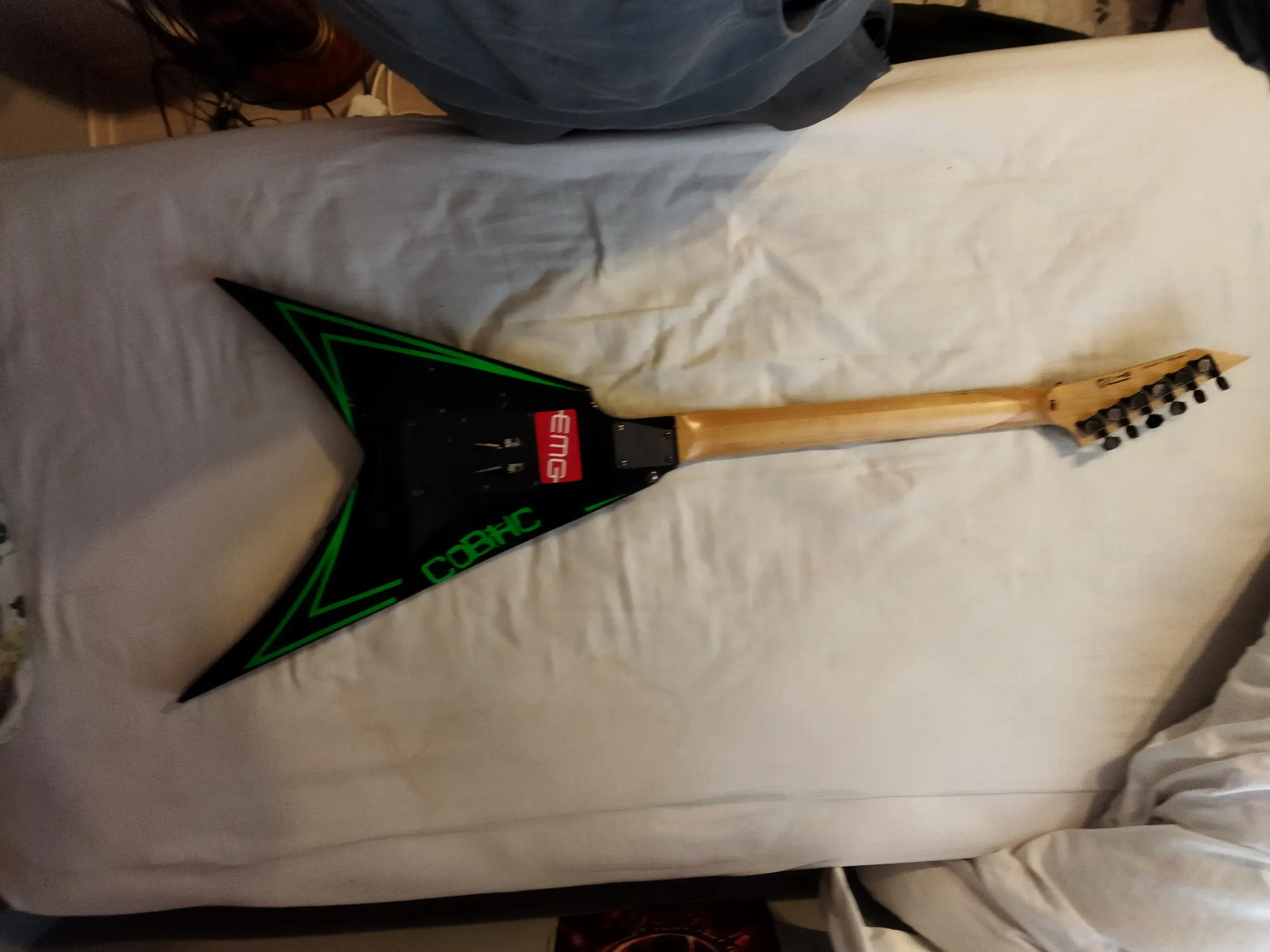 Gitar 1 senedir bende 600 geçtiğim için satıyorum üzerinde esp greeny grafiği var bakımları düzenli yapıldı floyd rose yayları fr original ile değiştirildi(eski yaylar mevcuttur) Yedek saddlelarıyla beraber verilecektir.