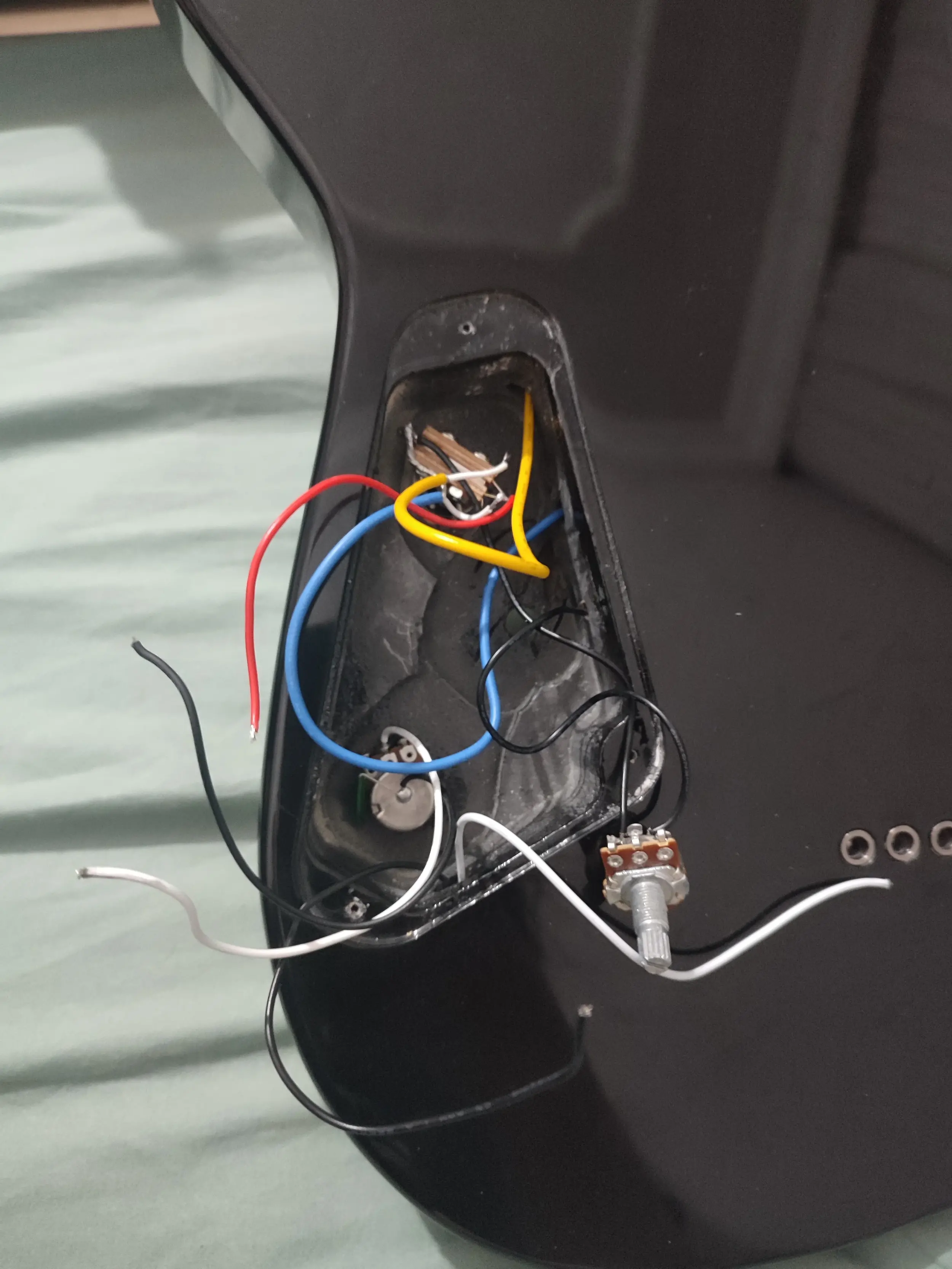 Çıkış jakından gelen beyaz kabloyu ses potunun orta ucuna, siviçten gelen kırmızı kabloyu ses potunu ilk ucuna, ton potundan gelen beyaz kabloyu da ses potunun siviçten gelen ucuna, boşta kalan siyah kablolarda şase