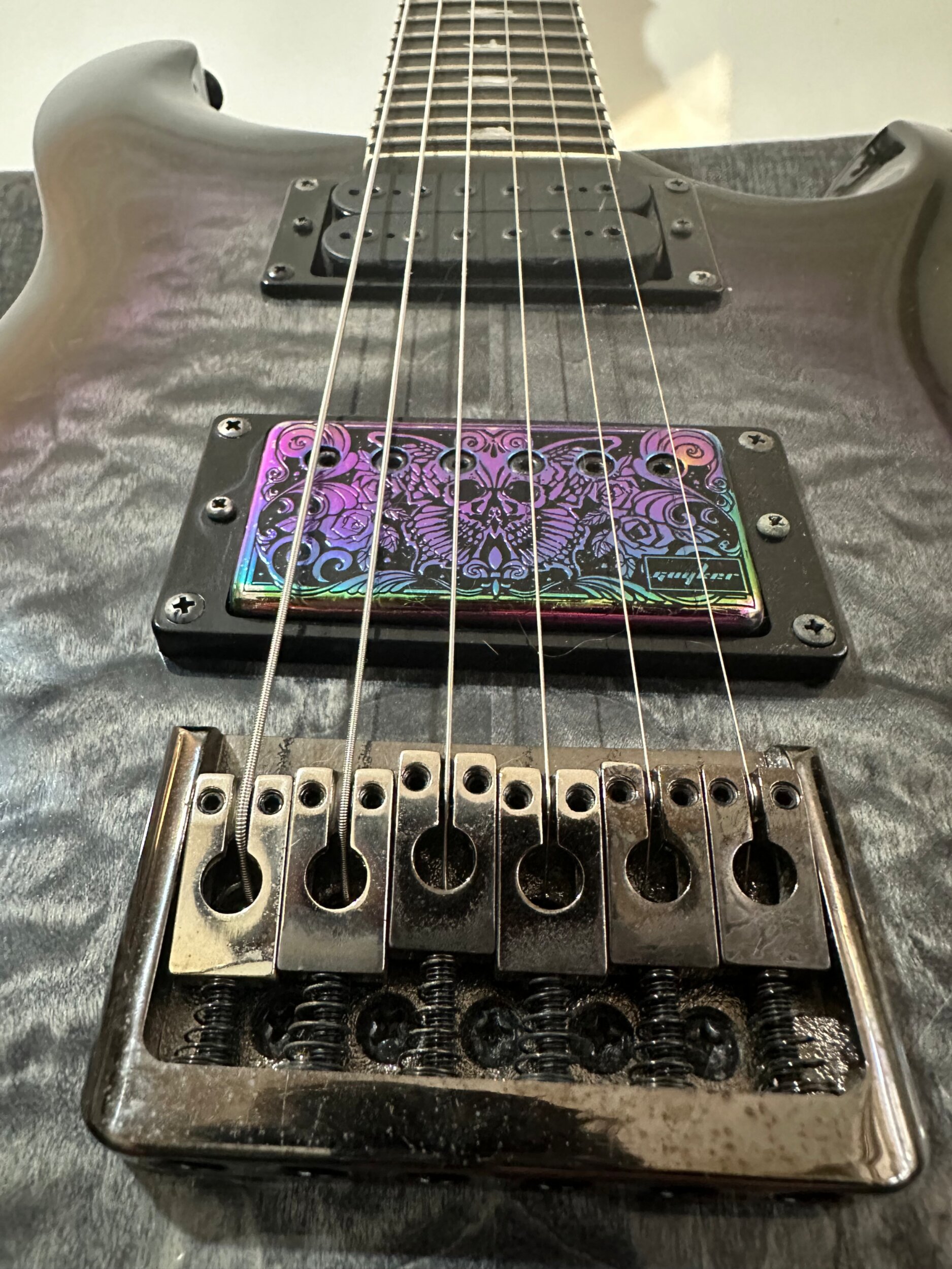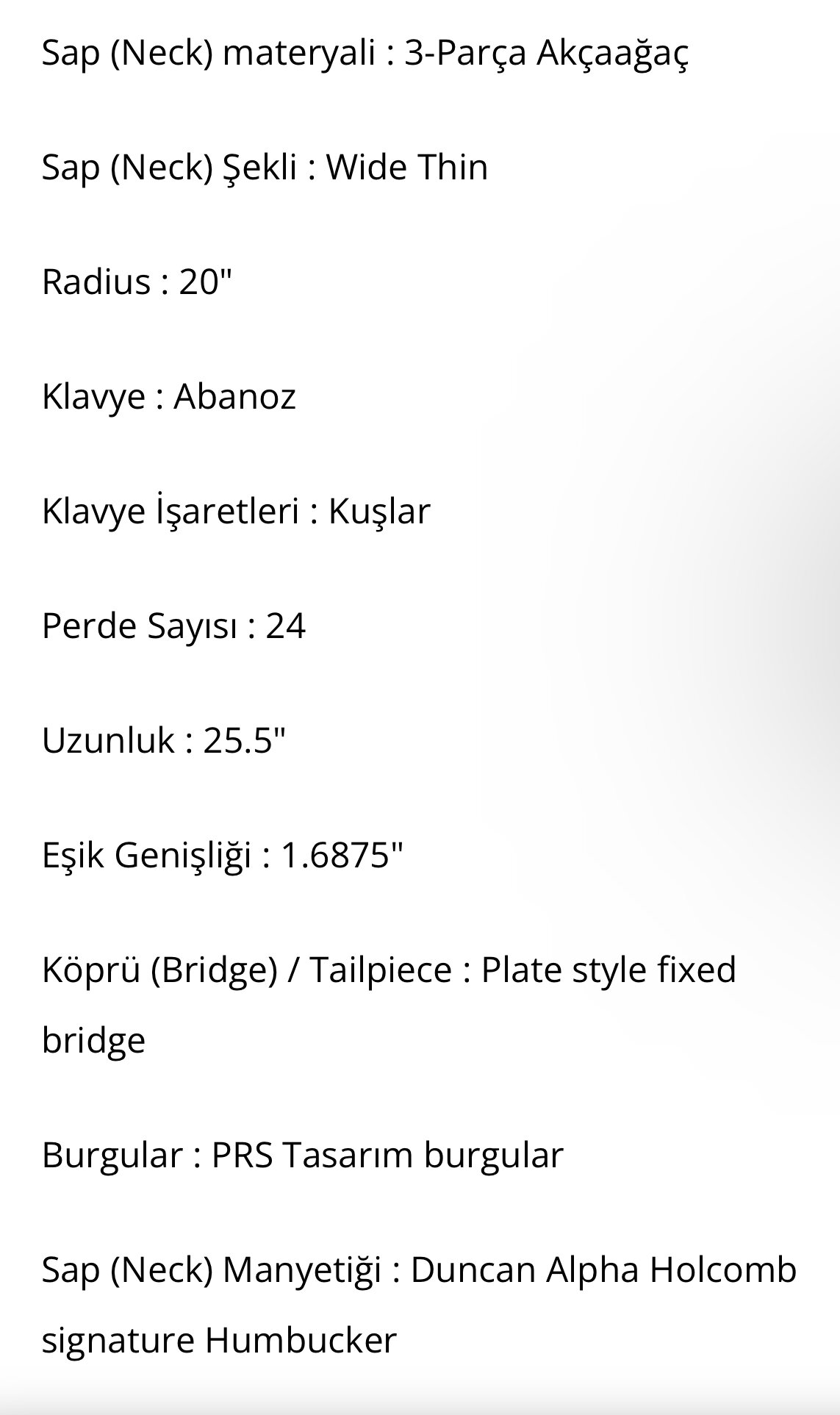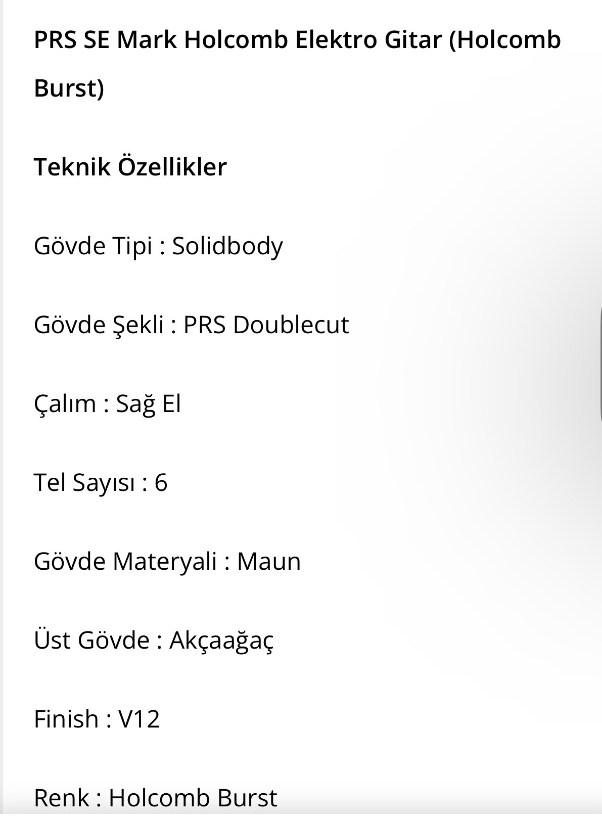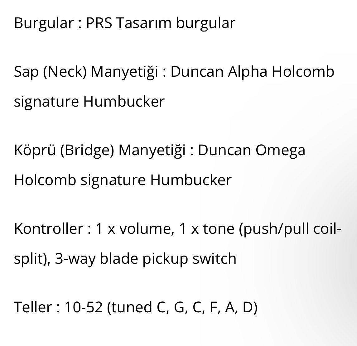 PRS SE Mark Holcomb (Holcomb Burst). Tüm özellikleri fotoğraflarda mevcut. 1 seneye yakın çaldım. Fotolarda görüldüğü gibi çalımdan, temizlemeden kaynaklı bazı ufak tefek kılcal çizikler mevcut, onun dışında herşeyi sapasağlam. Bakımı ayarları Kadıköy AbiGuitars’da yapıldı Bilgehan abi tarafından. Ufak bi pazarlık payı var.