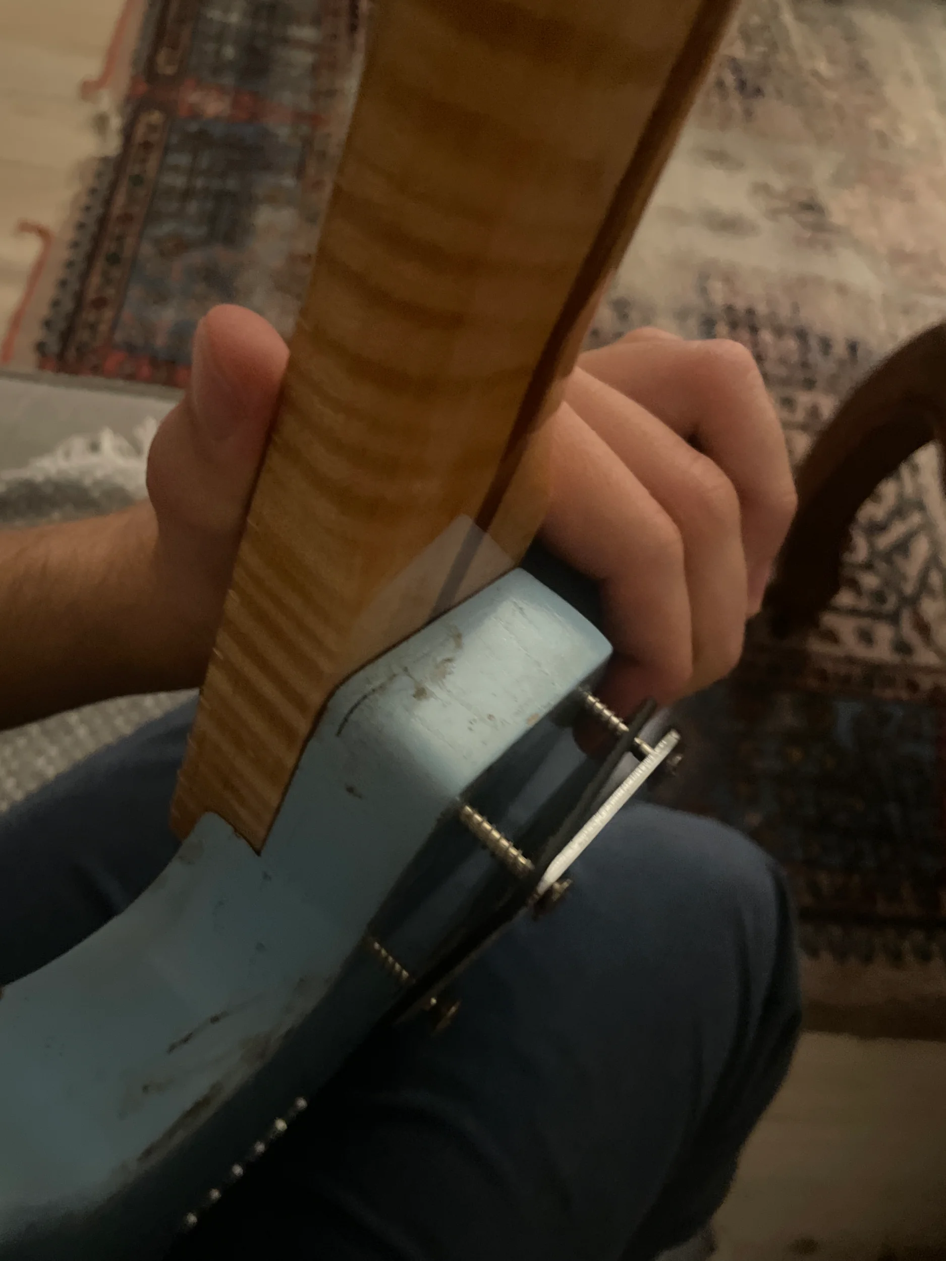 Aldığım vidalı Les Paul'de vardı bu. Sapın yan yüzeyini şerit zımparada biraz yiyerek düzeltmiştim. Saptan biraz almak lazım ama ne tarafının alınması gerektiğini luthier bilir. O kararı sen verme derim, geri dönüşü olmayan bişey yapabilirsin.