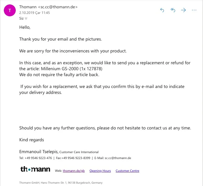 Geçenlerde verdiğim siparişteki gitar standı defolu geldi (birbirine takılması gereken iki parça kolayca takılmıyordu), kendim 10 dakika uğraşarak da halledebileceğim bir şey olsa da haberleri olsun diye Thomann'a mail attım. Ertesi gün, ürünü iade etmeme gerek olmadığını ve defodan dolayı yenisini gönderebileceklerini, ya da para iadesi yapabileceklerini söylediler. Müşteri hizmetleri çok çok iyi.